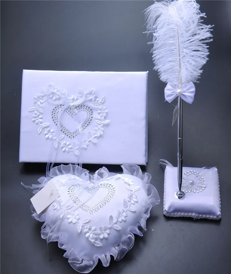 3Pc set Burlap Hessian Lace Crystal Wedding Guest Book Pen Set Ring Pillow